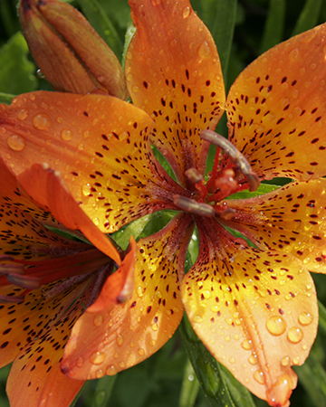 This lily is the lily most commonly seen in Fairbanks and called “Tiger Lily” by the locals. It blooms prolifically with bright orange blooms with a touch of gold in the throat. It quickly forms clumps and needs to be divided occasionally or it will begin to die off. It blooms very early and is extremely hardy.