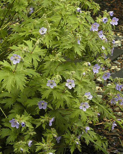 Geranium erianthum (Wooly Geranium) has an upright habit and grows in sun or shade. It holds its light blue blossoms well above its foliage. It will naturalize to form drifts.