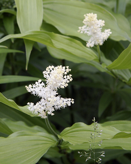 Maianthemum stellatum (Starry False Solomon’s Seal) is a beautiful and aggressive ground cover. It slowly spreads with underground stems and makes a striking repeating pattern of foliage. It has plumes of small white flowers in spring. I grow it in full sun in moist soil but it may prefer shade.
