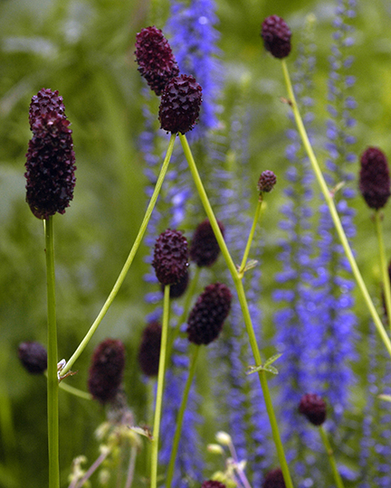 Sanguisorba officinalis (Great Burnet) is very dramatic with its chocolately red colored blooms atop 4 foot stems. It prefers full sun and can tollerate poor soil and dry conditions.